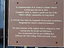 St. Monica's Roman Catholic Church, after years of neglect and partial collapse, has been re-purposed as a child's day care center.[9] According to Robert Hampton, president of York College which is part of the City University System, St. Monica "symbolizes in many respects what York College symbolizes to its community. A place for people to transform their lives as St. Monica had to transform her life. It's important to have a sense of history."[9] In December 2003, ground was broken and acquired for the York College Child Care Center, cost a state-funded $4.7 million; this project's architecture represented "a fashion of something old and something new".[9] This two-story, 10,000-square-foot steel and glass day care center incorporated the two-story brick facade and bell tower, which were all that remained of the 1856 Roman Catholic Church.[9] The Church's walls and roof collapsed in 1999 following 12 days of torrential rain fall .[9] However, the relic was saved on the recommendation of the New York City Landmarks Preservation Commission.[9]