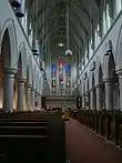 The cornerstone of St. Patrick's Church was laid on September 17, 1855,[2] by Bishop John T. Mullock and other distinguished clergy from Canada and the United States. American financier, Cyrus Field, contributed £1,000($107,123.88 in USD 2019)[3] to help with construction costs. The church was designed in the late Gothic Revival, also termed Neo-Gothic, style by J.J. McCarthy, a prominent Irish architect, and was built by T. O'Brien, local architect and mason.[4]