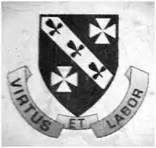 The school emblem consists of a green shield inscribed with two golden crosses on the upper right and lower left corners. A white belt runs across with three golden shamrocks for its patron St. Patrick. The motto is Virtus et Labor, virtue and hard work.[3]