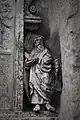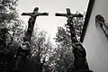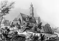 The graveyard surrounding St. Peter's includes three free-standing chapels: a Kapelle Unserer Lieben Frau (Chapel of Our Dear Lady), perhaps originally Romanesque, with a 15th-century ossuary;[11] the Agnes-Bernauer-Kapelle, the burial place of the like-named secret wife of Albert III of Bavaria, executed on charges of witchcraft;[12] and the Totenkapelle (Chapel of the Dead), built in 1486.[13] The latter is perhaps of the greatest artistic significance, on account of its extensive cycle of paintings representing the Totentanz (Dance of the Dead), created by the Rococo artist Felix Hözl (died 1774), a resident of Straubing, in 1763. The cycle is of note as an 18th-century treatment of a predominantly medieval theme.[14]