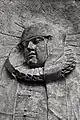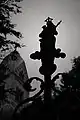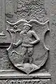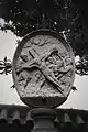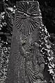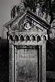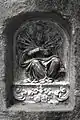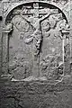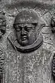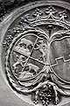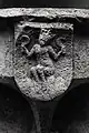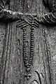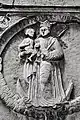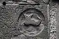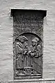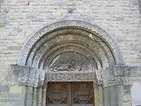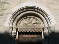 Two portals provide access to the building, one from the west and one from the south. The tympanum of the west portal portrays a knight, armed with sword and shield, battling a dragon. The head of a man, whom the dragon has swallowed, is visible between its jaws. The representation may allude to the words of Psalm 35/34: