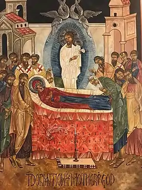 From 2004 to 2006, a local artist, Mary Jane Miller, produced icons in the traditional Byzantine art style following the traditions of icon writing.[11] The icons were created at the nearby William King Museum of Art.[12] The collection totals twenty-two icons, eighteen of which depict important events in the life of Jesus Christ, three of which depict events in the life of Mary, mother of Jesus, and a recent addition was included titled "The Mystical Supper."[12] Although the icons are venerated in Eastern Orthodox Churches, as a protestant church, St. Thomas Episcopal Church uses the icons to teach about the life of Jesus Christ.[11]