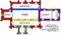 Internally the arcades are in different styles, the south arcade being Early English while the north arcade is Perpendicular.[3] The flooring is of 19th-century tiles. The font also dates from the 19th century and is in 15th-century style.