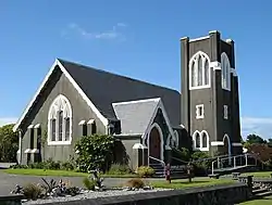 The first St Andrew's Church in Hokitika was built in February 1867, following the arrival of the first minister of the Hokitika parish, Reverend John Gow.[1] It was a wooden building with a prominent spire, sited on Stafford Street.[2]