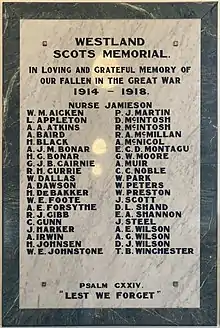 The church contains the Westland Scots Memorial, a marble roll of honour listing forty locals fallen in the First World War.[1]