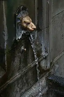 The new St Ann's drinking well of 1852 was designed by architect Henry Currey and it dispensed warm chalybeate (mineral-bearing) spring water alongside a cold water pump. The Pump Room was built next to St Ann's Well in 1894 to dispense the well's water from taps for drinking. The building (designed by Henry Currey) was a gift to the town by the 8th Duke of Devonshire, to safeguard the free public access to the water.[17] In 1895 a new public drinking pump was erected next to the Pump Room. The current water fountain was built in 1940 and is a Grade II listed structure.[18] It is made of ashlar gritstone with a brass lion's head spout pouring water into a marble trough. The inscription over the well is a tribute to Emelie Dorothy Bounds, Councillor of this Borough, by her husband and daughter. The bronze statue of St Ann and child is by the English sculptor Herbert William Palliser (1883–1963).[19] The Pump Room is a Grade II listed building and is now the Buxton Tourist Information centre.[15]