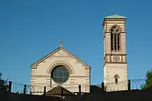 The architect was Sir Arthur Blomfield, a son of the Bishop of London, who had previously designed the chapel for the Radcliffe Infirmary. The architectural style is that of a Romanesque basilica, possibly modelled on San Clemente in Rome or the Church of Santa Maria Assunta in Torcello. St Barnabas has a distinctive square tower, in the form of an Italianate campanile, that is visible from the surrounding area. The church was built on land donated by George Ward, a local land owner and member of the influential Ward family (named as the donor in the land conveyance, etc. in the Oxford Diocesan Archives). George's brother William Ward was Mayor of Oxford on two occasions, 1851/2 and 1861/2.[4] It was consecrated in 1869 by Bishop Wilberforce of Oxford and the campanile was completed in 1872. The pulpit was added in 1887 by Heaton, Butler, and Bayne with the panels painted by Charles Floyce.[5][6] This replaced a cylindrical timber pulpit with columns and a moulded cornice which is now at St Peter's, London Docks.[7]
