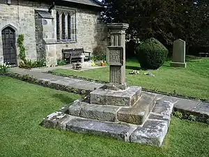 In the churchyard, to the south of the church, is a sundial dated 1708. It is in sandstone, and consists of a square base with three steps, supporting a square fluted Doric column with a base and a capital. On the top is a round brass plate with a gnomon. On the side of the sundial is a plaque inscribed with initials and the date. The sundial is listed at Grade II.[4][7] Also listed at Grade II are the walls around the churchyard, and the flight of steps leading up towards the church.[8]