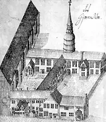 The brick Gothic building was Germany's second Dominican monastery after St Catherine's Monastery in Frankfurt. Its imposing church was consecrated to Saint Catherine in 1285.[1] The monastery was extended in 1400 but was closed in 1528 as a result of the Reformation. The grammar school known as Schola Bremensis or Gymnasium Illustre moved into the premises and, from 1660, was served by the Bibliotheca Bremensis, the extensive library which was established there.[2][3] In the early 19th century, the church was the city's arsenal as can be seen from Jacob Ephraim Polzin's painting.[4] For a short period from 1900 to 1905 it even became home to the city's historical museum with Johann Focke's collection.[1] It was later used by local merchants as a storehouse. After suffering serious damage during the Second World War, the church was demolished in 1960.[4]