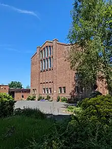 The building is constructed of concrete, with brick facades, and a concrete roof vault. The main part of the church consists of a single space, serving as both nave and chancel, with side aisles, a narthex at the west end, with stairs leading to an organ gallery, and a chapel at the east end. There is a tower at the north-west; this incorporates a porch. The tower has a flat roof and has a brick niche containing a statue of Saint Chad. Externally, the building is divided into bays by full-height buttresses, and the walls are topped with a parapet of moulded brick. There is a priest's doorway at the south-east corner, with its own small tower. The windows are lancets, arranged at the west end in multiple tiers.[1]
