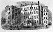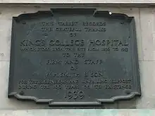 King's College Hospital was originally opened in 1840 in the disused St Clement Danes parish workhouse in Portugal Street, as a training facility where medical students of King's College London could practice and receive instruction from the college's own professors. Booth's poverty map shows a generation later remnant streets of the intense poverty which formed much of the parish of the 1840s — overcrowded tenements characterised by poverty and disease and the hospital was treating annually 1,290 inpatients in 120 beds, with two patients sharing a bed by no means unusual.[6] The hospital later moved to its present site in Denmark Hill.