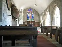 The ceilings of the body of the church are plastered, while the wagon roof of the north chapel is open. Between the nave and the north chapel is a carved wooden screen. There is a piscina in the chancel, and another in the south chapel. The font dates from the 17th century, and consists of a round bowl on a cylindrical stem. It is carved with rosettes and cherubs. On the floor near the entry to the north chapel is a round stone bowl. The chancel contains a communion table dating from the 17th century, and on its east wall is panelling from the same period. In the church are two sets of choirs stalls dating possibly from the 15th century with misericords carved with such features as a grotesque head and a bird. There are other items from the 17th century, including carved benches, a chest and chairs. The lectern consists of a gilded eagle on an oak plinth dated 1914. On the walls are four hatchments, and near the south door is a benefactions board dated 1790.[1] At the west end of the church is a two-manual organ. This was built in 1912 at a cost of £300 (equivalent to £31,600 in 2021),[6] and was moved to the west end in 1924 at a cost of £36 (equivalent to £2,200 in 2021).[6][8] There is a ring of eight bells. These were all cast by Rudhall of Gloucester, six of them in 1709 and the other two in 1808 and 1829.[9]