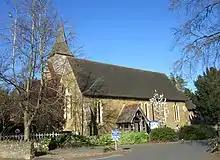 - ↑ An early-1980s photograph of the church showed a long building with a low-pitched roof, a small cross on the gable and a recessed entrance below wooden panelling.[52]