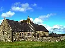 According to the 19th-century antiquarian Angharad Llwyd, it is said that the first church was built here in about 620. By the time she was writing, the church was attached to the parish of St Machraeth's Church, Llanfachraeth.[5] St Enghenedl's was rebuilt in 1862 by Henry Kennedy, the architect of the Diocese of Bangor. Another church was subsequently built in the parish, in the village of Valley. As Valley grew, St Enghenedl's declined in use and it eventually closed. It was dismantled in 1988 and rebuilt as an extension to St Mihangel's Church, Llanfihangel yn Nhowyn, so that it could serve as the church for RAF Valley. St Enghenedl's was re-erected with its west end adjoining the west end of St Mihangel's, which had also been built by Kennedy in 1862. The old east window of St Enghenedl's now faces west, and the bellcote is in the middle of the roof.[6] The churchyard, gravestones, and lychgate of St Enghenedl's remain in their original location, but the churchyard is now overgrown.[7]