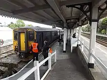 The station buildings are constructed of granite in an 'L' shape west and north of the St Ives bay platform. The booking office is staffed for part of the day and is located in the west-facing section which faces the station car park. The northern range incorporates staff accommodation as well as refreshment facilities which appeared in a list of the ten best station cafes published in The Guardian in 2009.[17] Platforms 2 and 3 have a long canopy above them to protect passengers waiting for their train. At the west end of this is a covered footbridge which links with the main westbound platform for trains to Penzance, and a large wooden shelter is provided here. A small granite building further up the platform is for staff use. As with several other stations in Cornwall, small palm trees grow on the main platforms, both of which can accommodate seven-coach trains.[18]
