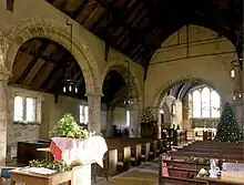 Inside, the aisles have arcades with circular piers.[2] The chancel has remains of a piscina, and has corbels in the eaves with early carvings of animals and two sheela na gigs.[2][4][5] There is also a carved mass dial. There are fragments of three 10th century Anglo-Norse crosses, and one Saxon cross.[1][2] There is a brass monument of about 1400, which is believed to depict an abbess of Syningthwaite.[3][2] The plain bowl font was moved from Tockwith.[4] There is also an altar table from about 1600 and an eagle lectern of similar date.[2]