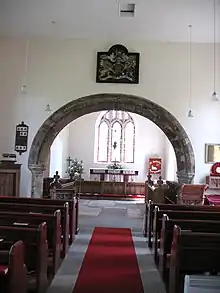 Inside the church is a font, which is octagonal and probably dates from the late 17th century. There is a mediaeval stone slab memorial to Alice Saltmarsh, a Victorian coat of arms painted on wood, and a wooden plaque from 1821 which records the church's benefactors. There are three bells, one undated, and the other two dating from 1666 and 1738.[1][2]