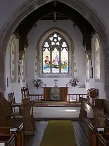 The church consists of a nave, with a south porch, chancel and tower. The nave is in three bays, marked on the outside by buttresses. The inner stonework of the windows dates from the Victorian restoration. The window in the second bay on the north has some ancient exterior stonework remaining.[1] The squat tower is rendered and has diagonal buttresses.[2] It was built around 1545, but an earlier tower may have been either planned or actually built. The evidence for this is in the sixteenth century Perpendicular style tower arch which sits on apparently fourteenth century shafts which are too small for it, leading to an awkward appearance.[1][2][3] The chancel dates entirely from the restoration of 1863.[2] It has fourteenth century style windows and a buttress in the middle of the north and south walls. The chancel arch is fourteenth century.[1][2][3]