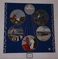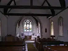 The plain octagonal font was installed in 1883.[1] The banner, with scenes from the lives of Sussex saints, was designed by Yvonne Hudson and worked by the ladies of the church.[4] The modern east window shows the gospel story of the miraculous catch of fish with Chichester cathedral in the background. It was made by M.C.F. Bell in 1978.[1] There are a fourteenth-century bell, inscribed "IOHANES" and one with the name William Hunneman and the date 1695.[1]