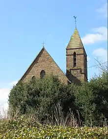 The church is constructed in red sandstone rubble with ashlar dressings. It has a roof of red tiles that are pierced along the ridge. Its plan consists of a four-bay nave, a short chancel with a vestry beneath, and a northeast tower. The tower is located in the angle between the nave and the chancel, and is buttressed. It contains a clock face and louvred lancet bell openings. At the summit is a pyramidal cap with a weathervane. The nave windows are small, with three lights and trefoil heads. On the sides of the chancel are two lancet windows. Beneath the chancel, the vestry has a door with a Caernarvon arch, and a two-light mullioned window. The east end is buttressed and contains a triple lancet window. At the west end are four lancet windows with trefoil heads, with a quatrefoil window above, and an entrance doorway leading to an internal porch.[2]