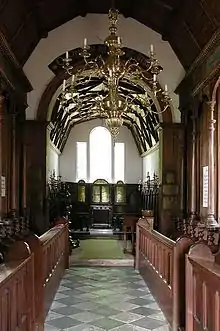 The nave is 13.66 feet (4.16 m) wide and 32.75 feet (9.98 m) in length and fewer than 30 people can be accommodated in the stalls lining the wall of the nave. The chancel is 12 feet (3.7 m) wide and 22.75 feet (6.93 m) in width. On the south side of the chancel is a late 19th-century vestry which is a little larger than one half the width of the chancel.[6]