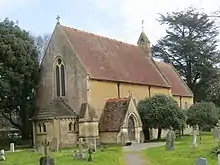 The church was designed by London architect George Edmund Street in 1864–1865, in Early English style.[4] Given the relatively ordinary-looking exterior, the interior is quite unexpected. The tiling throughout, reredos, low chancel screen wall, font, pulpit, oak choir stalls and free-standing nave benches were completed before 1868. The reredos has a gabled centre with Crucifixion. The stained glass in the chancel was made by Clayton and Bell.[5] The bellcote over the east end of the nave has one bell.