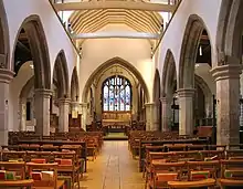 The West Tower and South Porch date from the 15th century.[3] The vestry was designed by Temple Moore, and built in 1911. The stained glass windows are of many designs and ages, including two by Ninian Comper. The edges of the windows were restored by J. L. Pearson in 1879-80, and paid for by A. W. Tooke, a wealthy landowner in Pinner, and the son of William Tooke. Pearson also built the current church roof with gables, replacing an earlier one with attic windows.[4]