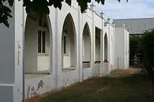 Both side elevations are similar, and each consists of a pointed arch arcade with parapet concealing a skillion roof to the side aisle. The pointed arches are separated by pilasters which extend above the parapet giving a castellated effect. Each arcade has a concrete floor, and a vestry is located at the rear. The windows to the side aisles are separated by buttresses, and consist of triple leadlight lancets with lower casements sections set in a pointed arch composition. Paired timber doors housed in a pointed arch open from the side aisle to the arcade. Each vestry projects from the arcade, and the side wall has six narrow pointed lancet windows, and a pointed arch timber door opens to the rear. The clerestory to the nave has paired leadlight lancets set in a pointed arch recess. The southwestern side has a concrete ramp with metal handrail accessing the arcade.[1]