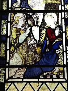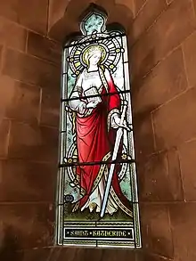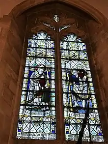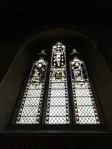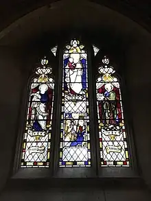 There are stained glass windows by Burlison and Grylls, a company founded in 1868 at the instigation of Bodley & Garner. The stained glass east end window is dated 1886 while the west window shows Saint Nicholas and Saint Christopher, for William Howley Kingsmill (1838-1894), of Sydmonton Court, is dated 1933,[14] given by his widow and children. A brass plaque says that the east windows were placed by (major-general) Edward Coysgarne Sim (1838-1900) (Royal Engineers) and Alice Frances Howley Sim his wife to the Glory of God and in pious memory of (her parents) William Kingsmill who died February 11, 1865 and of Anne Jane his wife (daughter of Archbishop Howley) who died June 20, 1871 also in memory of (their son) Arthur Coysgarne Sim, Midshipman, RN who died February 24, 1894, aged 18.[15]