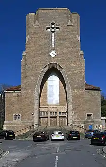 The church is part of a joint parish and benefice with St Ethelburga's Church in nearby Bulverhythe. This brown-brick building was designed in a simple Gothic Revival style in 1929 by John B. Mendham. A pinnacled Art Deco-style clock tower dominates the exterior.[16][34] The parish boundaries are the English Channel coast to the south; to the west, Glyne Gap and the western boundary of the borough, almost to the Crowhurst Road; to the northeast, the railway line between Crowhurst and West St Leonards railway stations; then behind West Hill Road, Archery Road, Quarry Hill, Kenilworth Road and Gensing Road.[35] The parish was reunited in 2009, 80 years after it was originally split to allow St Ethelburga's to become a separate parish church. The parish boundary had been Grosvenor Gardens.[36] The advowson (patronage) is held by the Hyndman's Trustees, based in Sheffield.[37]