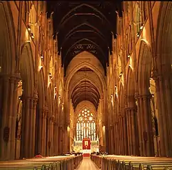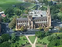 The cathedral is sited along a ridge running north–south on the eastern edge of the central area of the city and projects a dominating and inspiring presence, its roof and towers rising up above the neighbouring buildings and trees. The four arms of its plan establish axes that link it to the harbour and Woolloomooloo, to Hyde Park and to College and Macquarie Streets. The long English form of the building restates and reinforces these axes, powerfully weaving the cathedral into the urban fabric. As well as providing majestic vistas from the harbour and Potts Point, from Hyde Park and the adjacent streets, and from the elevated viewpoints of many central city buildings, the cathedral offers from within beautifully framed and precious vistas of the surrounding city. It is the largest nineteenth-century ecclesiastical building in the English archaeological Gothic style anywhere in the world. The refinement and scholarship of its composition and details are of the highest rank. Together with St Patrick's Cathedral in Melbourne, St Mary's is the major ecclesiastical work of architect William Wardell, a Gothic Revival architect of international significance practising in Australia. The cathedral is a repository of many items of aesthetic significance from the stained glass windows to the altars, statues, vestments, liturgical objects, paintings and mosaics and is important as a venue for musical events and has a considerable role in the practice of bell ringing in Australia.[25][3]