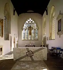 The hexagonal wooden pulpit is dated 1627 while the church has a 15th-century traceried wooden screen to the Lady Chapel in the East bay of the South aisle. The baptismal font is a 19th-century replica but stands on an early octagonal base. There are 15th-century benches near the chancel.[4]
