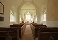 The interior is in white, including the boarded and plastered ceiling vault. Behind the latter, the roof timbers are scissor-trusses. The floor is in brick, laid in a herringbone pattern in 1789. The box pews are of the same date, but these were cut down in size in 1865. Older pews survive, dated 1637.
