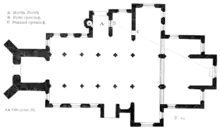 The church has a traditional but complex, cruciform plan, orientated east-west.[1] The building consists of a sanctuary of two and a half bays, a choir of two bays with north and south chapels, an aisled nave of five bays, transepts with parallel porches, and a low west tower.[1] North of the chancel is a vestry dated to 1902, replacing the octagonal structure constructed in 1854.[18] According to the Church of England, the church has a floor area of 1,085 square metres (11,680 sq ft), which makes it a 'very large' sized building; the 6th-largest parish church in the county.[6]