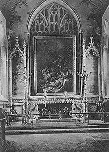 Reordering of the east end followed in 1937.[17] The floor tiles installed in 1878 were removed and the floor was lowered. The east window was blocked to make the painting of the Descent of the Cross more prominent, and the walls were plastered.[17] The tower and spire were also repaired as part of this work. The tower and spire would be repaired again from 1993-1994 when scaffolding was erected the full height of the structure.[3]