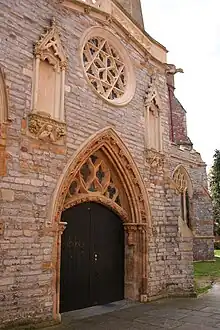 The nave has both aisles and clerestory, featuring windows with pointed arches and hoodmoulds.[1] The nave is lit by a series of large Perpendicular transomed windows. The north and south transepts, with their accompanying porches, feature large oculus windows with tracery in the star pattern, made from Bath stone.[1] The north transept has a late 19th century window with elaborate reticulated tracery; its door is flanked by green men.[29] The chancel, like the tower, is constructed from Wembdon sandstone, which gives it a distinctive red hue, and has a large five-light east window, divided by transoms and mullions.[1]