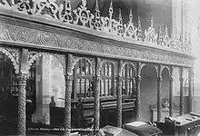 The nave as built was supplied with a carved medieval rood screen separating it from the chancel; later, the organ was placed above it.[30] In the restoration of 1848-1857, the medieval rood screen was removed from its position separating the nave and chancel, cut into two, and one-half of each placed behind the choir stalls, where they remain to this day. Each screen has five monograms, representing the initials of ten unknown people linked to the church in some way.[31]