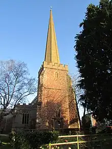 In 1814, the spire was struck by lightning during a severe thunderstorm, resulting in a deep crack developing in the structure.[3] It was repaired "with great difficulty" the following year by Thomas Hitchings, a local builder. A series of poles were attached to the spire with ropes, followed by the fixing of a ladder so that the capstone could be reached. The capstone was too badly cracked to be fixed, so was replaced. To prevent a recurrence of the problem, a lightning conductor was fastened to the top of the spire and a long metal rod was placed inside, where it was bolted to the centre of the tower in the belfry.[3][16]