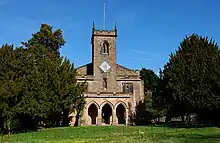The Historic England summary states that the church features a "wide nave with lower and narrower chancel, west tower flanked by gallery stair turrets and with west narthex" and that the exterior is "in a lavish free Perpendicular style".[1]