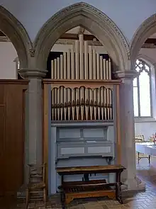 The church contains a two manual pipe organ by Bishop & Son of Ipswich and London.[7] A specification of the organ may be found on the National Pipe Organ Register.[8] It was resited in 2012–3 to make room for kitchen and toilet facilities at the west end of the north aisle.[9]