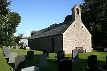 The church is built from rubble masonry, dressed with sandstone, and measures 47 by 14 feet (14.3 by 4.3 m).[3][8] The entrance is at the west end of the north wall. The roof, which is made from slate, has a bellcote with one bell at the west end. The inscription on the bell states that it was cast in 1582, and the bell is also marked with a fleur-de-lys and the thrice-repeated initials "AMN".[3]