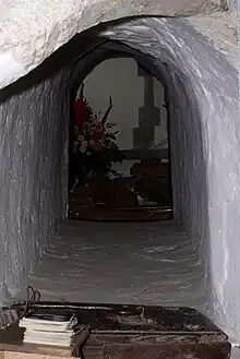 The church consists of nave, chancel and a south aisle separated from the nave by a three-bay arcade. The chancel arch is in the form of two arches, one inside the other, designed to accommodate the 5-foot (1.5 m) thick east wall, which supports the belfry.[8] The pointed arches of the south arcade are supported by round piers with varying capitals. In the angle of the chancel and south aisle there is an early thirteenth-century chapel.[8] Two round-headed Norman windows remain; the west window of the south aisle and the centre window in the north window of the chancel.[5][8] The chancel east window has the only stained glass in the church.[5] The "fantastically long"[4] hagioscope, about 9 feet (2.7 m) in length and resembling a tunnel, runs from the south aisle into the chancel through one of the pillars of the arcade and the chancel arch. These architectural features allowed worshippers in the aisle to see the bread and wine being consecrated during the Celebration of the Eucharist.[6] The church is roofed with Horsham slabs, a common material in churches in the area.[5] The oak shingled spire of 1602 rests partly on the masonry of the old belfry, or bell turret, and partly on the east wall of the nave.[5][8]