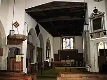 There is an ambry, now in the north wall, and a font bowl, rescued in the 19th century from the rectory grounds, having been buried there during the English Civil War. They are both Norman.[2][3]