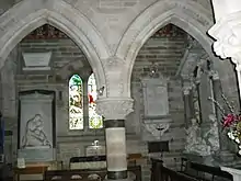 The south arcade, from about 1210, has circular columns, one still with a trumpet-scalloped capital. The north arcade has octagonal columns and re-used 14th century capitals. The pointed tower arch, of three chamfered orders, is blocked and flanked by semi-circular headed niches. The chancel arch is pointed, has dog-tooth moulding and is supported on short columns with foliated capitals. Similar detailing has been used by Street throughout the chancel.[2]