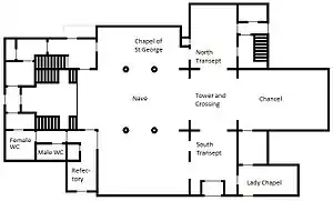 A refectory was constructed in the old south porch of the church moving the main entrance to one on the south transept.[1]