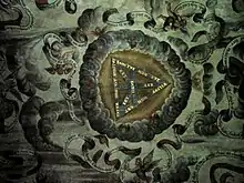 Between the nave and the north aisle is a two-bay arcade in Early English style. In the east wall of the chancel is a re-set piscina, and the south wall contains a 14th-century tomb recess. The ceiling of the chancel was painted in 1672 by Thomas Francis. It depicts the Shield of the Trinity surrounded by cherubs and texts, and angels holding a bible open at Psalm 85. The reredos consists of a triptych dating from about 1890 by the artist Charles Edgar Buckeridge. Also in the church are the Royal Arms of Charles II. The stained glass consists of a large series designed by Kempe dating from 1890 to 1922.[4] The two-manual pipe organ was built in 1866 by J. W. Walker. It was reconstructed and enlarged in 1890, and overhauled in 1991, on each occasion by Walker's.[5] There is a ring of six bells. Five of these were cast in 1737 by Abel Rudhall, and the sixth in 1890 by John Taylor and Company. The church has a Sanctus bell also made by Taylor's at about the same date.[6]