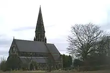 It is built in grey snecked rubble sandstone with grey slate roofs. Its plan consists of a five-bay nave with a clerestory, north and south aisles, an apsidal chancel, a south vestry, a south porch and a northeast tower with a spire. At the west end is a rose window above four lancet windows. The tower has a square base over which is an octagonal belfry surrounded by pinnacles, and a stone spire.[1] The authors of the Buildings of England series consider that the spire is too thin for such a substantial church and that the pinnacles are "unjustifiable".[4] The stained glass in the apse, dated 1894, and in one of the windows in the south aisle is by Kempe, and the stained glass in the windows at the west end, dated 1907, is by A. K. Nicholson.[3]