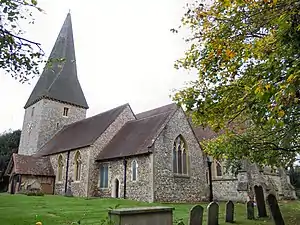 The "very good" south door with its "very delicate" carving attributed to stonemasons associated with Chertsey Abbey[6] and its adjacent walls are c1170 with some 13th-century remains in the chancel. The 15th-century broach spire-topped tower is built of ironstone[7] with a peal of six bells - five dating from 1798[4] and the sixth, the Peace Bell - added in 1919. This treble bell was added at the same time that the cracked tenor bell was recast.[8] Situated on the church's south-west corner, the tower is short and square with small louvred openings at the top of each wall with irregular openings placed elsewhere. The south porch is of the 16th century. By the 19th century the Norman church was becoming too small for the growing congregation[4] and it was restored and extended in about 1865 at which time the north aisle and north chancel chapel were constructed. The nave is built of roughly coursed flint and sandstone rubble. The large window in the east end is 19th-century of three lights in the late 13th-century style, but a single 13th-century lancet window is still to be found in the south chancel wall. In the Victorian north wall of the nave is reset a small 12th-century round-headed light, much repaired, while the three windows in the south wall date to the Victorian rebuilding.[1][7][9]