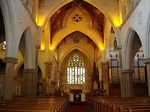 The cathedral building is made of sandstone from a quarry at Marulan, except for the pillars which are of Pyrmont sandstone. The roof is natural slate. The cathedral is unmistakably a Blacket church, on a grand scale, with nave, aisles, transepts, chancel, porches and tower. It has large and elaborate stone traceried windows and an impressive interior with a heavily carved hammer beam roof, clustered columns and foliage capitals, elaborately moulded arcades and chancel arch, and a striking use of figurative roundels in the nave, transepts and chancel.[5][1]