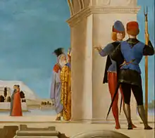 The visit of the Sicilian artist Antonello da Messina to Venice in 1475–1476 has traditionally been seen as turning point in the history of the city's painting – Giorgio Vasari crediting him with introducing oil painting to Venice. Antonello painted two altarpieces for Venetian churches, one for the church of San Cassiano, and the other, of which the St Sebastian once formed part, for the altar of the Scuola di San Rocca in the parish church of San Giuliano. It has often been assumed to have been painted in Venice in 1476, but it may have been painted only after Antonello's return to Sicily in the autumn of that year.[1] A description by Francesco Sansovino, dating from 1581, indicates that the altarpiece consisted of a wooden statue of St Roche, flanked by painted panels showing St Christopher and St Sebastian. Sansovino describes the panel of St Christopher as being by Antonello, and that of St Sebastian as being by "Pino da Messina" (i.e. his son Jacobello or "Jacopino"). However art historians have generally accepted Antonello's authorship of the St Sebastian. The statue and the painting of St Christopher are now lost.[2][3]